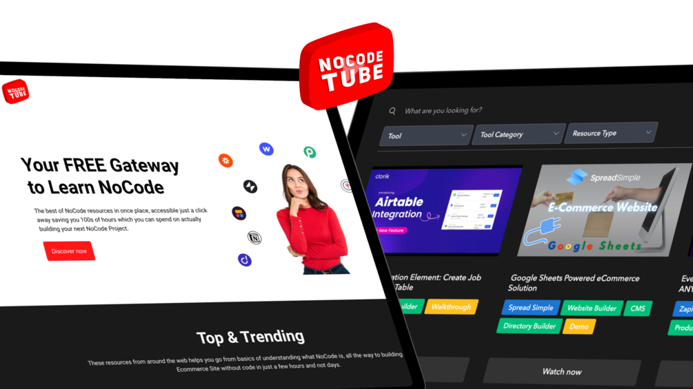 NoCode Tube takes you from being a NoCode Novice to NoCode Pro without requiring 100s of hours finding the right resource or walkthroughs. Instead sail through various categories of hand picked FREE resources and build your next NoCode/Digital product without breaking a sweat.